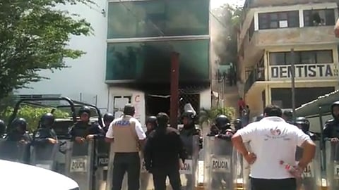 Los inconformes que se pronunciaron en contra de la Reforma Educativa, desalojaron y prendieron fuego a las oficinas como un desafío a las autoridades locales.
