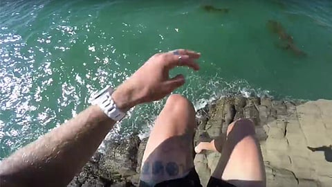 Identificado en redes sociales como "El Morro", decidió emprender esa aventura, en Crystal Cove State Park, California, Estados Unidos, y por un momento daba la impresión de que impactaría contra las rocas, según se observa en un video grabado con una GoPro.