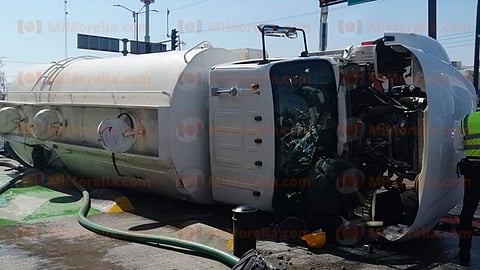 Morelia, Michoacán (MiMorelia.com).- Una pipa de agua volcó cuando se dirigía a brindar ayuda en un incendio de vehículos y patrullas en el corralón del Cuartel Valladolid, los ocupantes resultaron lastimados y varios litros de agua quedaron regados sobre la avenida Madero Poniente de la ciudad de Morelia.