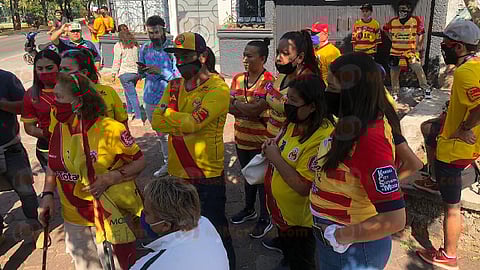 Poco a poco comienzan a llegar más aficionados a la convocatoria que se hizo a través de redes sociales, en dónde además de las playeras rojiamarillas resaltan los cubrebocas alusivos al equipo.