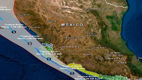 Narda, en el Océano Pacífico, se localizó a 120 kilómetros al sur de Zihuatanejo, Guerrero, con vientos máximos sostenidos de 75 kilómetros por hora, rachas de 95 kilómetros por hora y desplazamiento hacia el noroeste a 14 kilómetros por hora.