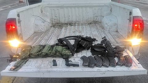 Entre lo decomisado a los indiciados están dos fusiles: uno Ak-47 y otro calibre 7.62×39 semiautomático, así como un arma corta, 12 cargadores y 488 cartuchos útiles a diferentes calibres.